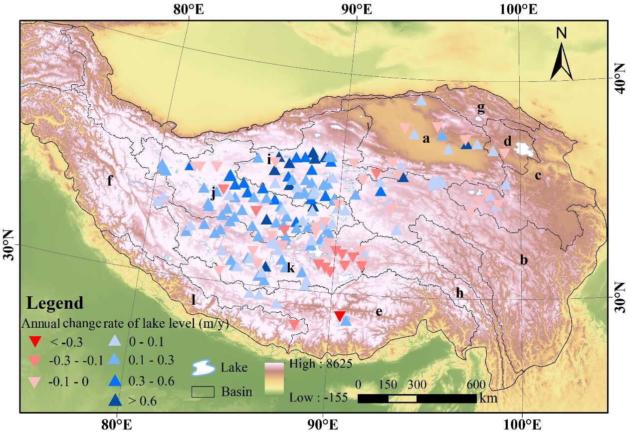 青藏高原湖泊水位时空变化分布(图中黑为流域界线)