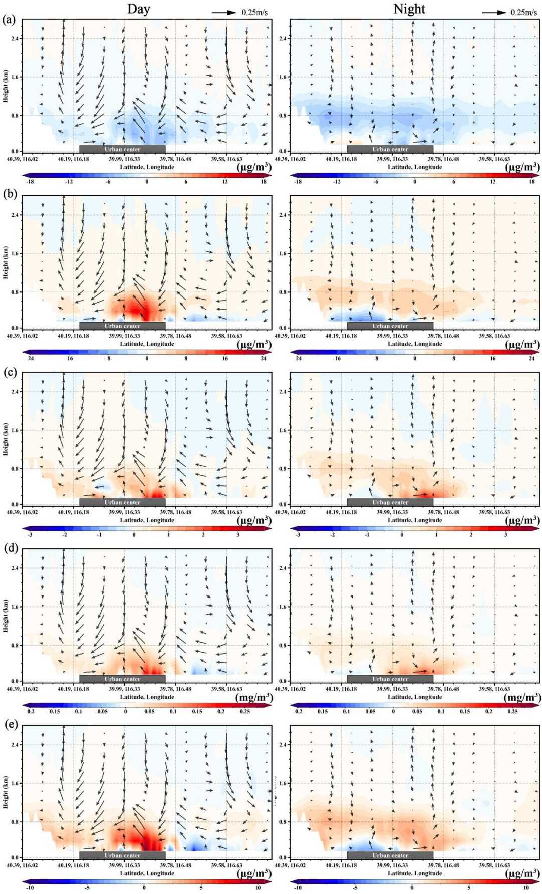图2 人为热冬季对(a) O₃、(b) NO₂、(c) SO₂、(d) CO及(e) PM2.5浓度垂直剖面的影响变化(Chem_AH与Chem_noAH对比)。箭头方向表示剖面内风向矢量(垂直速度×10)变化趋势。