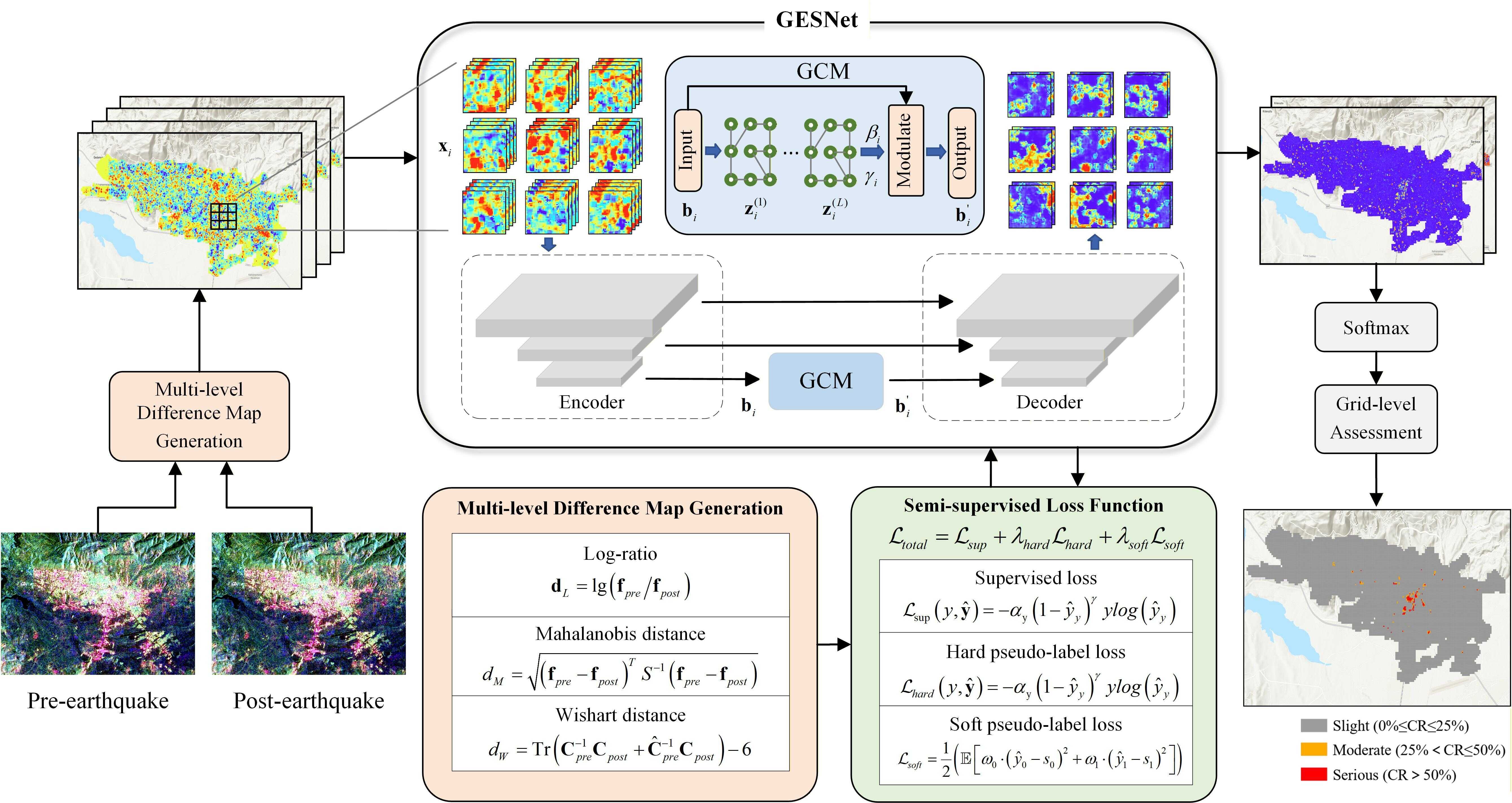 在获得高质量重建全极化数据后,为实现快速、准确提取灾害信息,研究团队提出基于图增强网络的全极化SAR半监督建筑物损毁评估框架(GESNet)。
