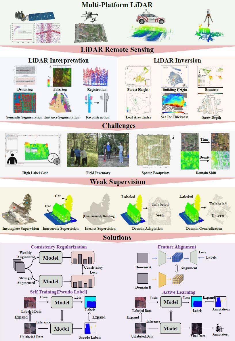 研究成果以“LiDAR remote sensing meets weak supervision: Concepts, methods, and perspectives”为题,发表于遥感领域权威期刊《ISPRS Journal of Photogrammetry and Remote Sensing》(中国科学院一区)。空天院博士高原和长沙理工大学讲师夏少波为第一作者,可持续发展大数据国际研究中心聂胜和研究员王成为通讯作者。合作单位还包括清华大学。研究工作得到国家自然科学基金资助。