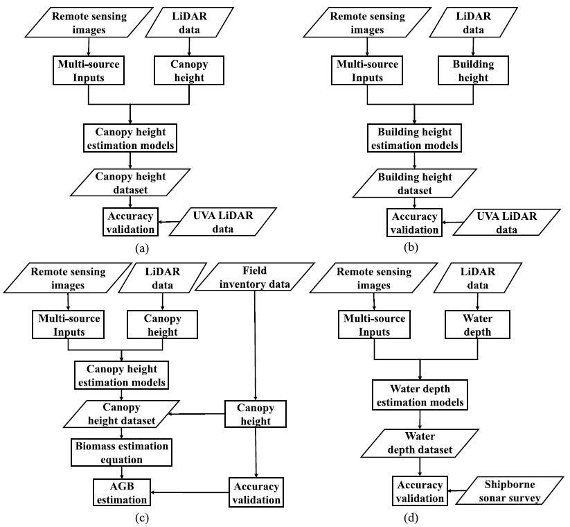 研究团队从广义的弱监督学习视角重新审视了大尺度遥感参数反演,重点探讨了如何利用稀疏的星载LiDAR(如GEDI、ICESat-2)足迹数据作为弱监督信号,联合连续、密集的卫星光学或雷达影像(如Sentinel、Landsat)进行地表参数反演。这种“由稀疏到密集,由离散到连续”的反演策略已被广泛应用于森林冠层高度估计、城市建筑高度提取、地上生物量测算以及浅海水深反演等关键对地观测任务中。