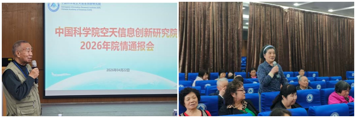 4月22日,中国科学院空天信息创新研究院(空天院)在中关村园区召开2026年度离退休全体人员大会暨院情通报会议。空天院院长付琨,党委书记、副院长张兵,人事处处长孙小舒以及退休老同志等共80余人参会。会议由离退休党总支书记李前康主持。