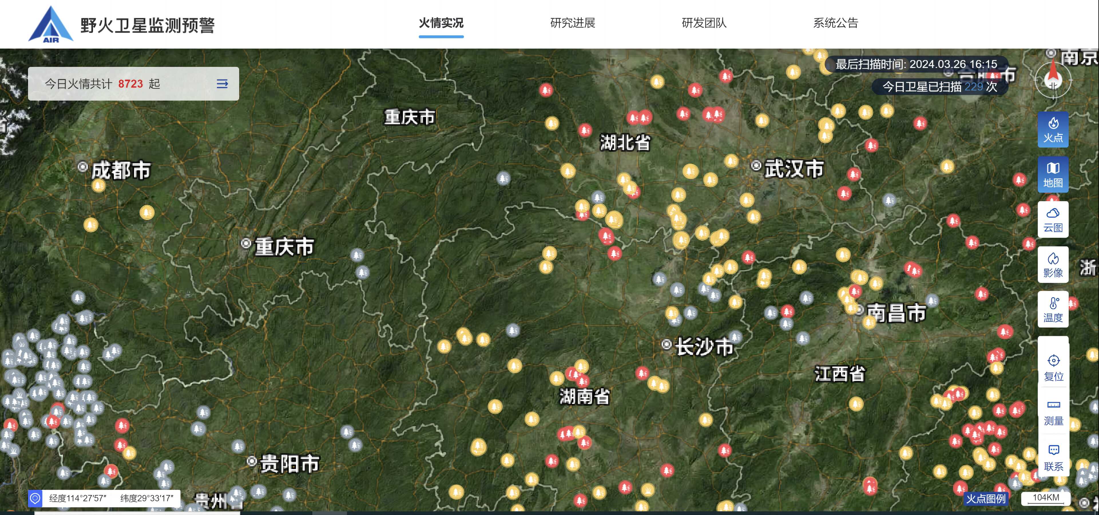 野火管控的重要前提是实现野火的高效监测。由中国科学院空天信息创新研究院自主研发的野火卫星监测预警系统,是一款基于卫星大数据、遥感AI算法、火情智能识别、信息快速分发等技术的野火卫星智能化监测平台。该系统集方法、模型、数据及软硬件于一体,耦合十余颗卫星形成开放式星座组网模式,及时发现东亚地区野火火情,实现对小火“早发现”和大火“持续性追踪”。同时,还具备野火火灾风险预警、蔓延模拟、灾后评估、排放核算等全方位功能,可用于应急、林草、环保、电力等应用行业、政府和研究机构,为掌握野火发生及发展实况、有效制定扑火策略和污染防控措施以及开展气候变化研究等提供数据依据。