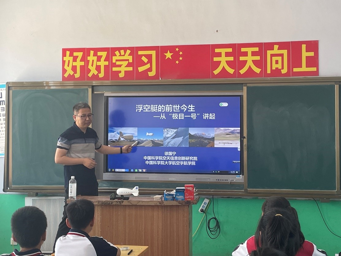 本次特邀讲授人为十部分工会主席徐国宁研究员。徐国宁以“浮空艇的前世今生”为主题,介绍了“极目一号”名字的由来及浮空艇的概念、工作原理、应用类型、优势特点、历史发展沿革等内容。课程层层深入,徐国宁用通俗易懂的语言、生动形象的比喻,巧妙引导同学们逐步思考、收获知识。报告中还穿插了青藏高原“第三极”、“天空为什么是蓝色的”、阿基米德的故事等有趣的科普问答,强烈激发起同学们的好奇心与兴趣。另外还设置了有奖问答环节,得到同学们的踊跃参与,不断将课堂气氛推向高潮。在授课的最后,徐国宁对同学们提出期望和约定,希望大家认真学习,将来有机会进入中国科学院继续深造,毕业后为国家做贡献。徐国宁还代表十部向校方赠送了浮空艇模型。