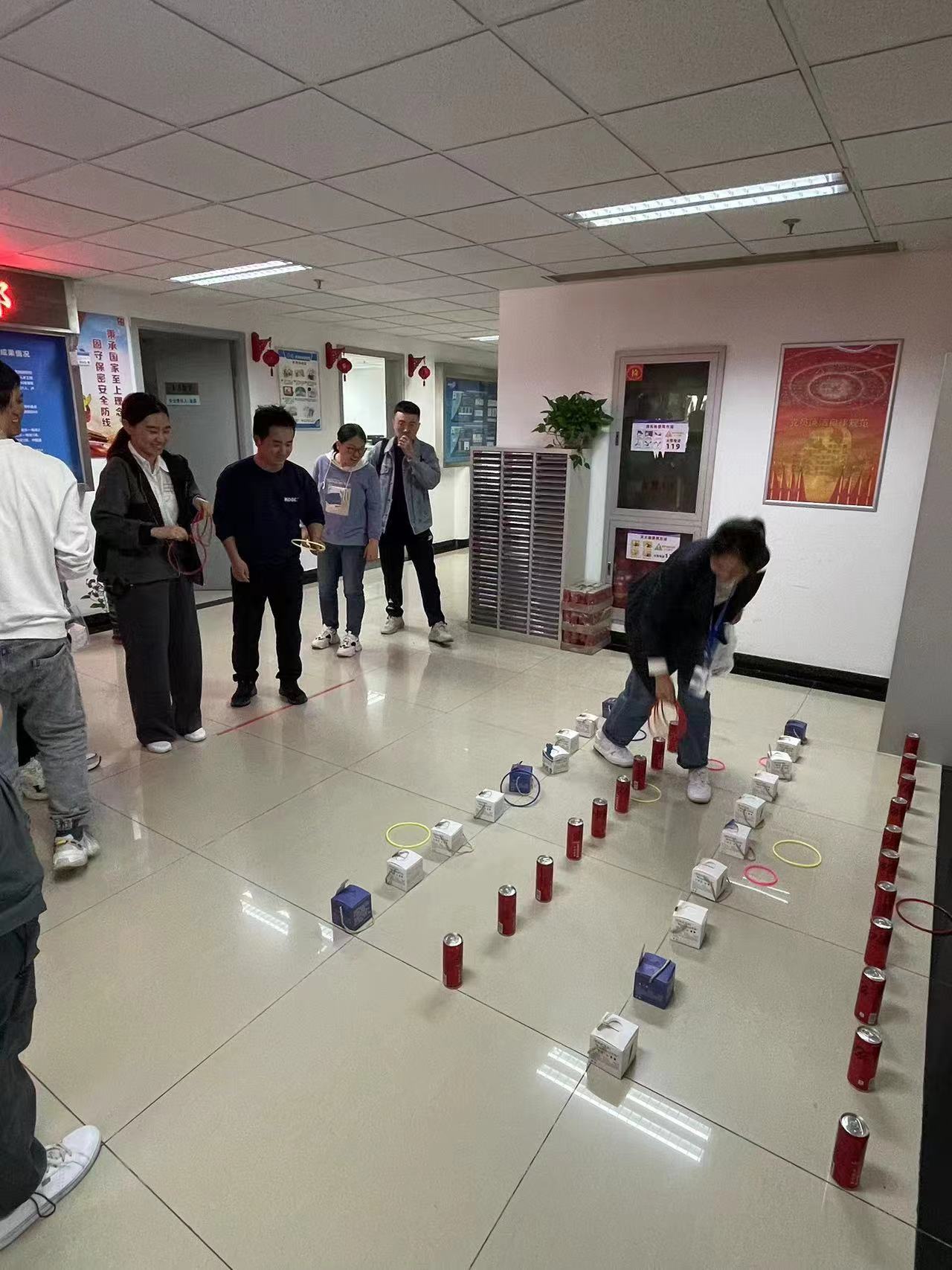 活动当天,工作人员将可乐和茶包分列摆放于部门公共活动区域,经过的职工在选定心仪的小礼品后就抛出套圈去套取礼品,套中即可带走。看似简单的小游戏实操起来也是“困难重重”,有的职工一发即中,有的只能铩羽而归,围观的同事们一边交流经验,一边为其他“战友”出谋划策,加油打气。整个部门充满欢声笑语,一派祥和之气。