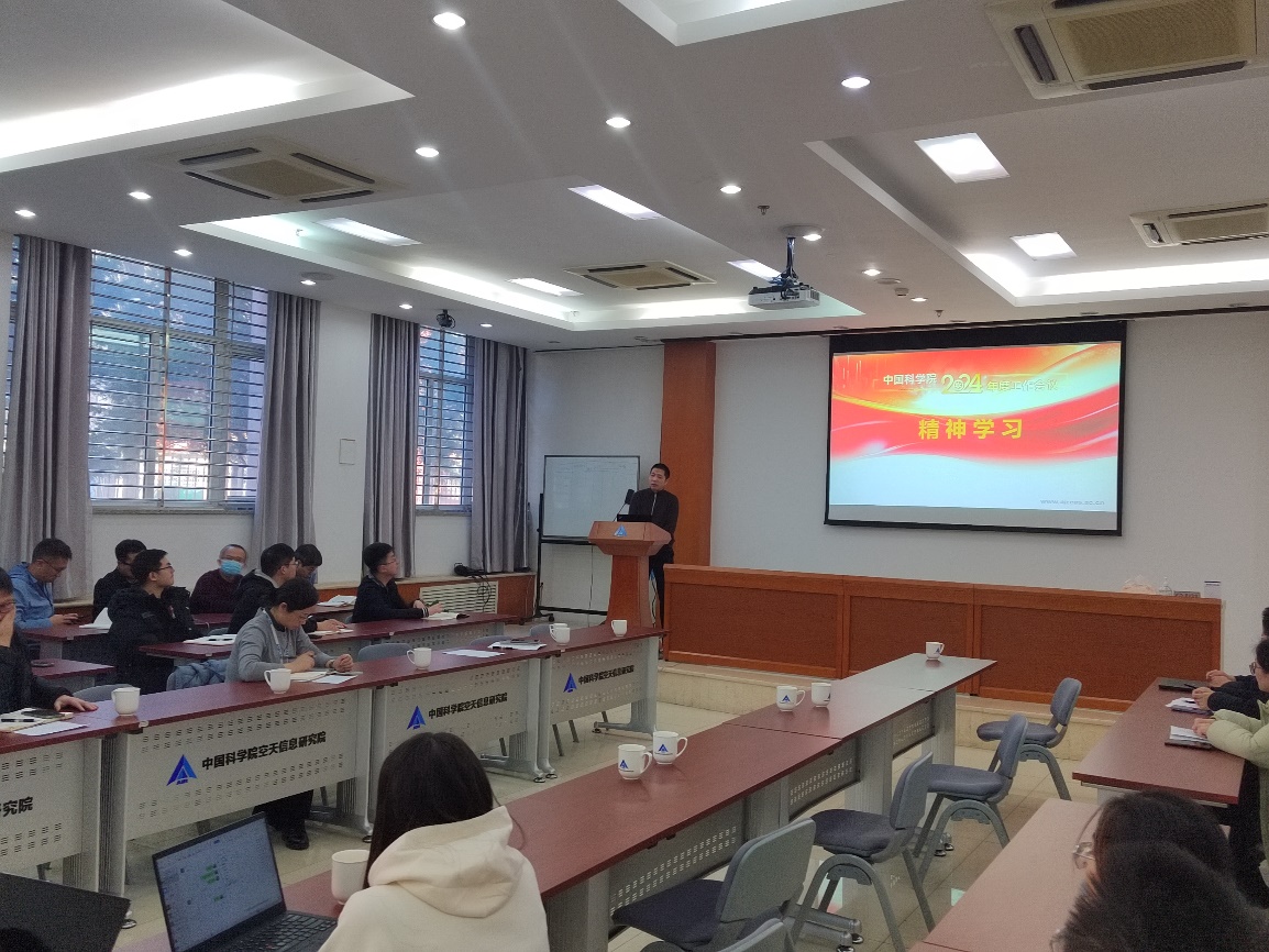 随后,一室党总支书记李亮同志带领全体党员一起学习了中国科学院2024年度工作会议精神,通过学习,要求大家进一步强化使命意识和责任担当,以舍我其谁的使命感、知重负重的责任感、只争朝夕的紧迫感,在科研岗位上充分发挥党员模范带头作用,加快抢占科技制高点。