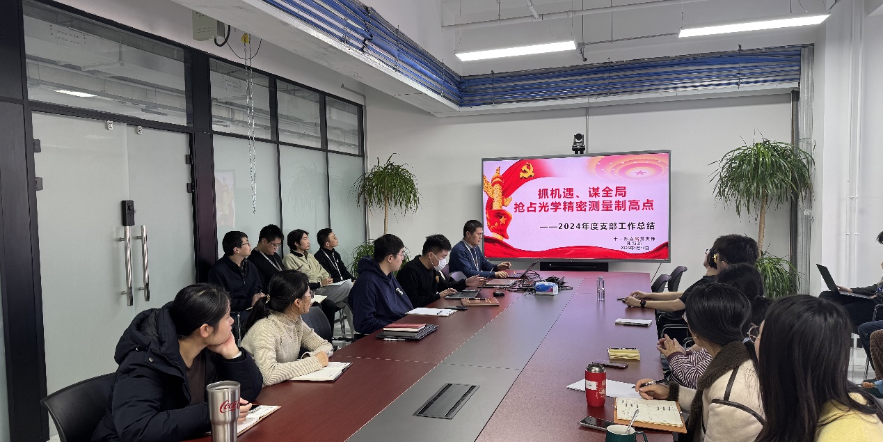 会议初始,孔新新作了2024年党建工作年终总结报告。报告主题为“抓机遇、谋全局 抢占光学精密测量制高点”,报告分为四个部分:支部基本情况、党建工作开展情况及亮点展示、抢占科技制高点成果展示、总结及展望。报告回顾了十一部直属党支部的工作亮点,党支部围绕“嵌入式”理论学习、“沉浸式”党性教育、“开放式”思想碰撞开展党建活动,以抓机遇、瞄需求、聚人才、促创新为支部使命,以成为光学精密测量领域的领航者为奋斗目标,聚焦于光学精密检测关键技术研究及仪器开发,引领广大党员同志勇挑重担,攻坚克难,为推动人类光学精密测量技术进步、实现中华民族伟大复兴贡献力量。