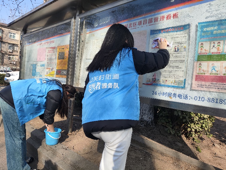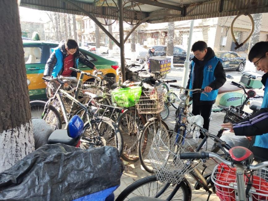 理论学习环节结束后,大家投入到实践活动中。同志们被分成两组,宣传栏和楼道小广告清洁组的同学们,手持清洁工具,仔细擦拭社区宣传栏,耐心铲除楼道内的顽固广告贴纸;车棚整理组的同学们将乱停乱放的非机动车重新摆放整齐,同时疏通消防通道,及时消除潜在的安全隐患。活动现场,同学们用实际行动生动诠释了“奉献、友爱、互助、进步”的志愿者精神。