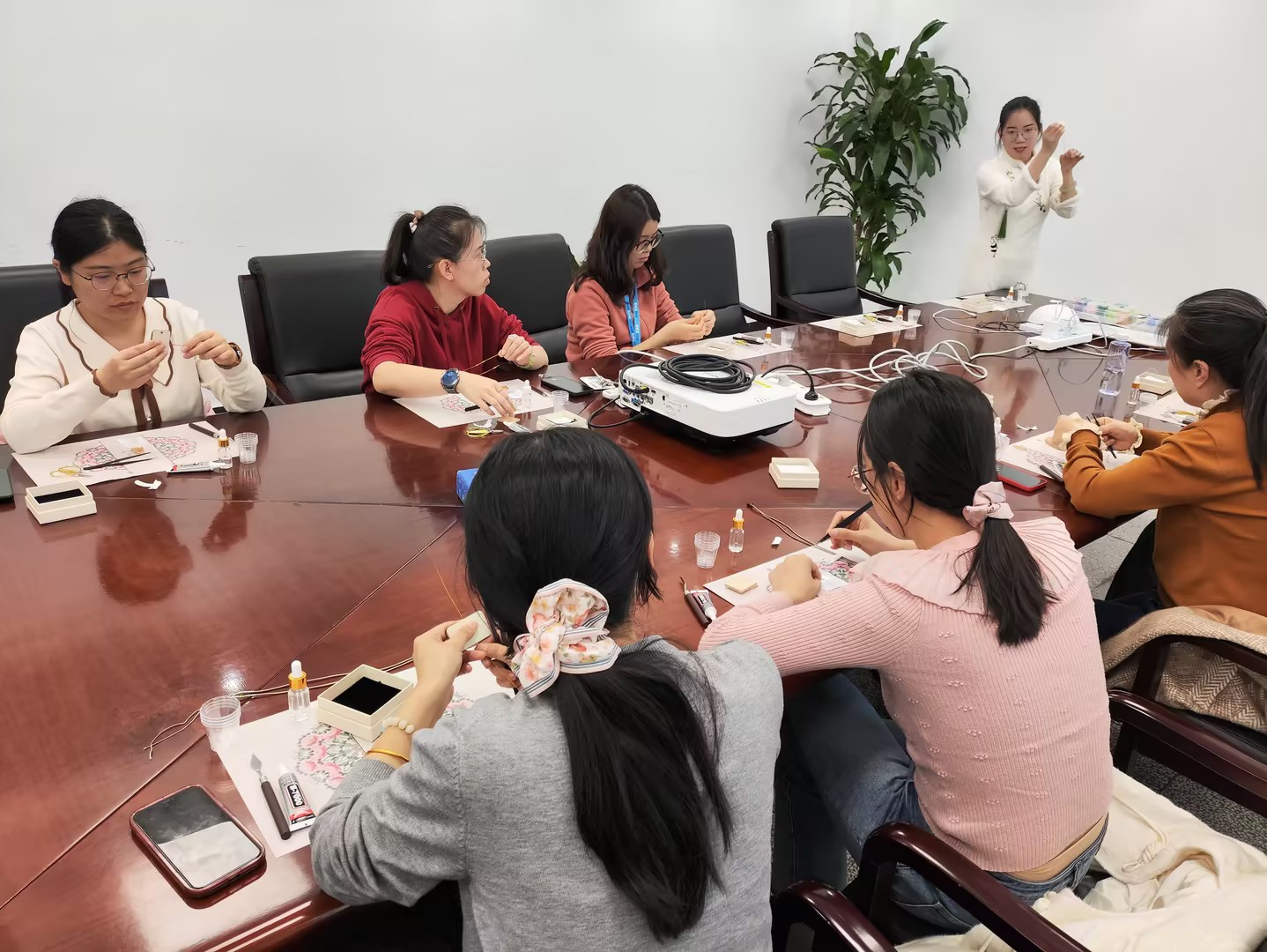 活动现场,指导老师首先为大家讲解了掐丝珐琅的历史渊源、制作工艺以及注意事项。起源于元代,在明清时期达到鼎盛的掐丝珐琅凭借其华丽的色彩和精湛的工艺,一直深受人们喜爱。讲解完理论知识后,便进入了紧张而有趣的制作环节。女职工们手持镊子,小心翼翼地将金丝沿着设计好的图案轮廓进行弯折、固定,这一步骤需要极大的耐心和细心,稍有不慎,金丝就可能变形或走位。接着,大家挑选各种色彩斑斓的珐琅釉料,根据自己的创意,细致地填充到金丝勾勒出的图案中。随着釉料的填入,原本单调的图案逐渐变得生动起来,色彩相互交织,散发着迷人的光泽。经过近两个小时的精心制作,一件件精美的掐丝珐琅吊坠在女职工们的手中诞生,每一件都独一无二,饱含着创作者的巧思与热情。
