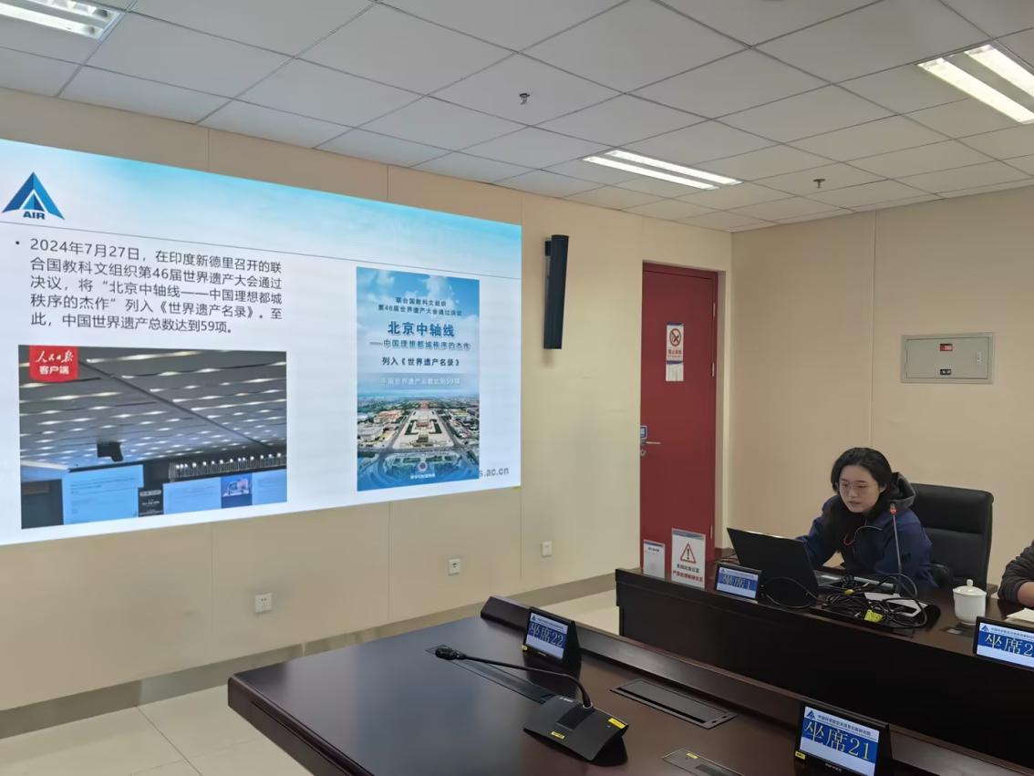 首期领学人为办公室冯丹,深入介绍了北京中轴线的历史沿革,展现北京中轴线上遗产构成要素,见证北京城市的变迁与发展。其中,重点学习了中轴线申遗成功的重大意义,解读联合国教科文组织对中轴线的评价,从而深刻领会中轴线作为中国理想都城秩序杰作的重要地位,增强文化自信与历史责任感。