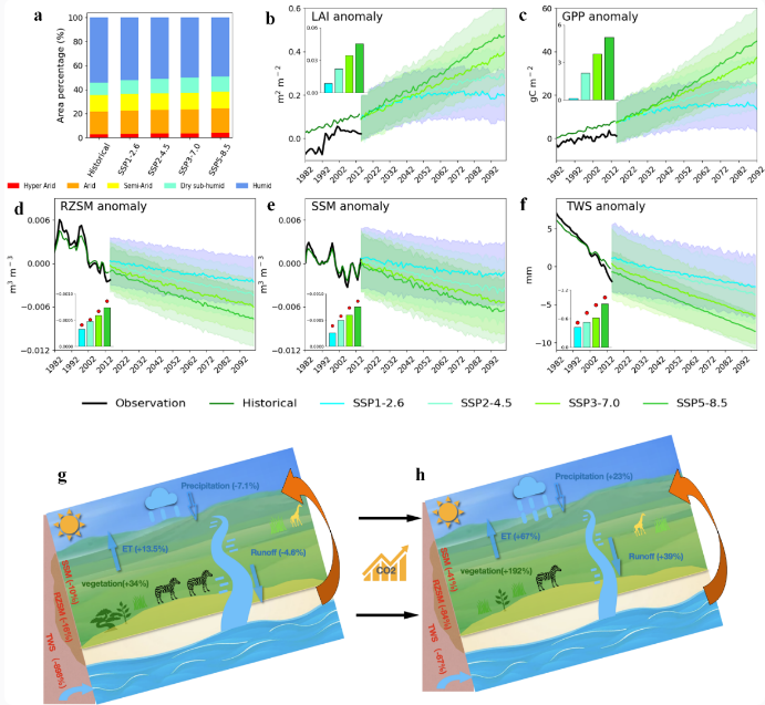 研究团队结合遥感观测数据、地球系统模型模拟和机器学习方法,对生态水文变量的未来趋势进行了预测。模拟分析结果表明,到2100年,干旱地区的陆地水储量可能会明显减少,而干旱地区的扩张可能达到4.1-10.6%。这一预测不仅揭示了干旱地区对植被生长持续不利的响应,还凸显了协调规划生态恢复、农业管理和水资源利用的紧迫性。