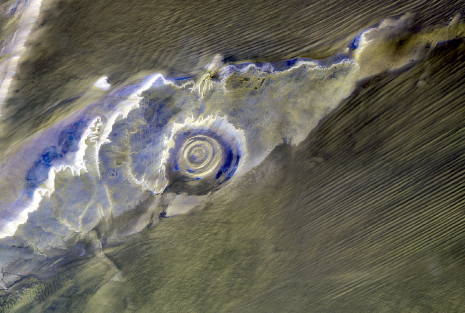 撒哈拉之眼位于毛里塔尼亚境内,是一个巨大的同心圆,直径达48km,在太空上清晰可见。此三波段合成的夜间热红外影像展示了夜间撒哈拉之眼与其他地方的热差异,清晰地刻画了夜间撒哈拉之眼的热分布。