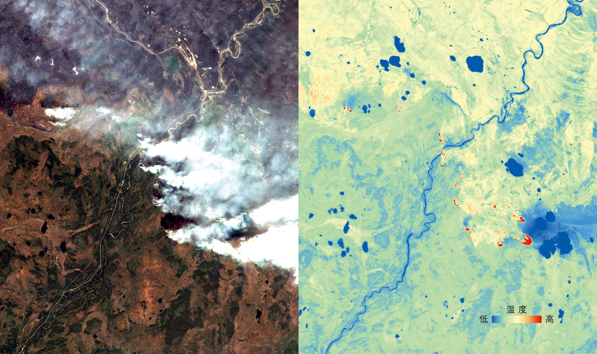 加拿大西北地区气候高寒,接近北极圈,冬季温度可达到零下40℃。区域内野火常由闪电造成,对森林生态环境造成复杂影响。热红外图像中过火区域明显,可以协助野火监控。