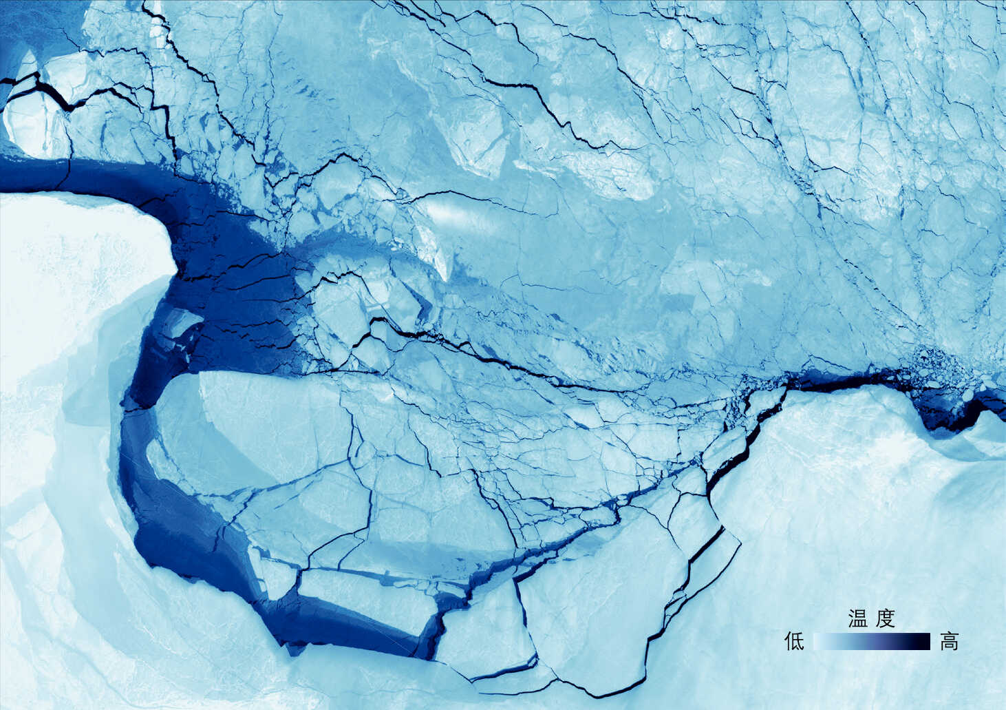 图为2023年3月28日在北极喀拉海东部北地群岛沿岸获取的 SDGSAT-1 热红外数据单波段(10.3 ~11.3μm)伪彩色影像,以浅蓝到深蓝的冷暖渐变表示海冰与海水的温度变化。大片深蓝色带状区域是一个尺度较大的沿岸冰间湖,其间暴露出温度较高的海水以及薄冰,与较厚的浮冰产生鲜明的温度对比。在30m分辨率下,海冰中细小的裂隙(冰间水道)也清晰可见,展现出丰富的细节特征。
