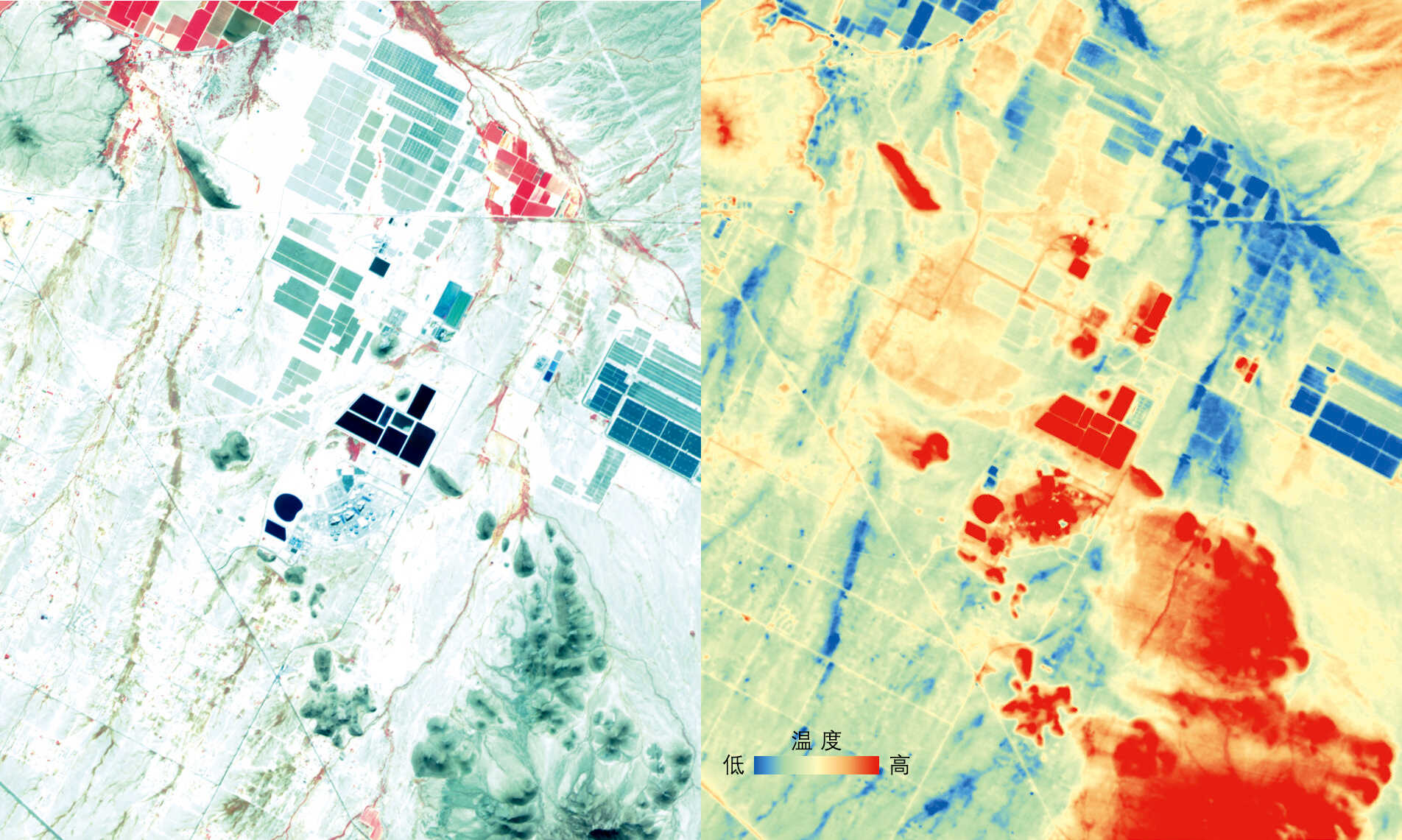 奇瓦瓦是墨西哥北部边境的一个内陆州,是墨西哥重要的农业生产地。奇瓦瓦境内环境高度多样化,日间热红外图像中,圆形的灌溉农业区温度较周围环境低,可见显著的温度差异。