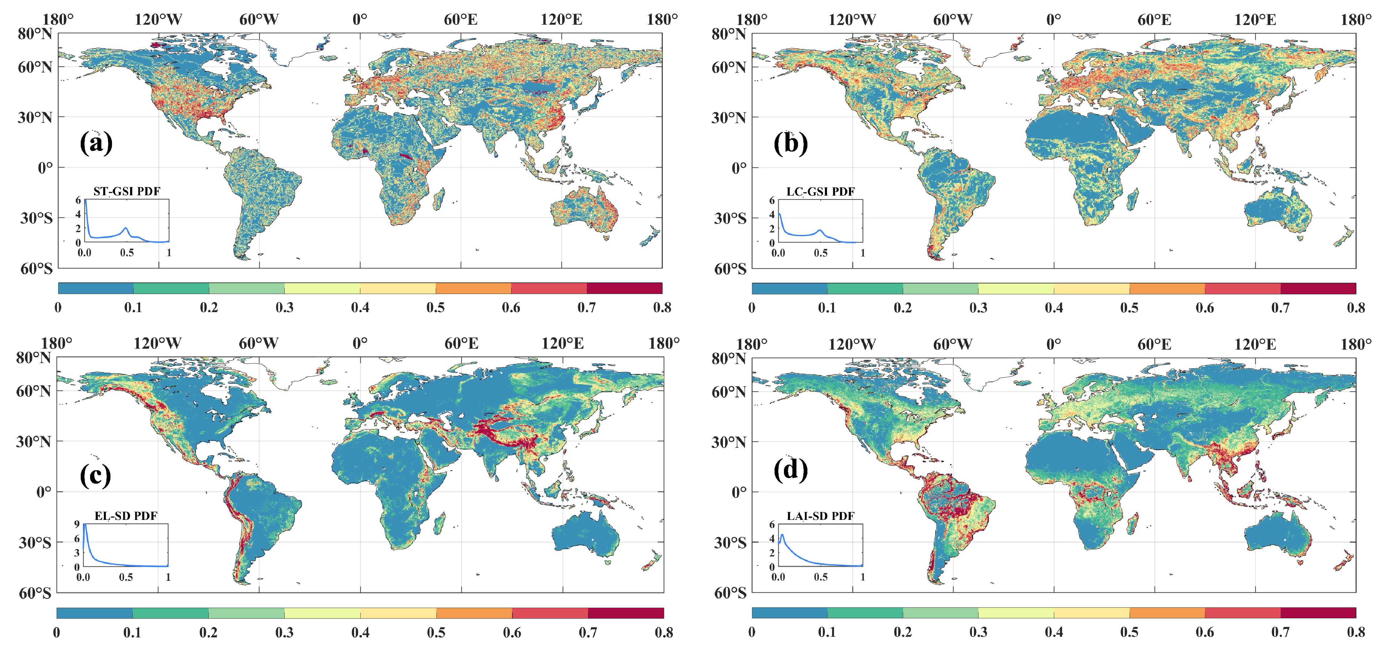 (a)土壤质地,(b)地表类型,(c)海拔和(d)叶面积指数LAI的空间异质性全球分布。