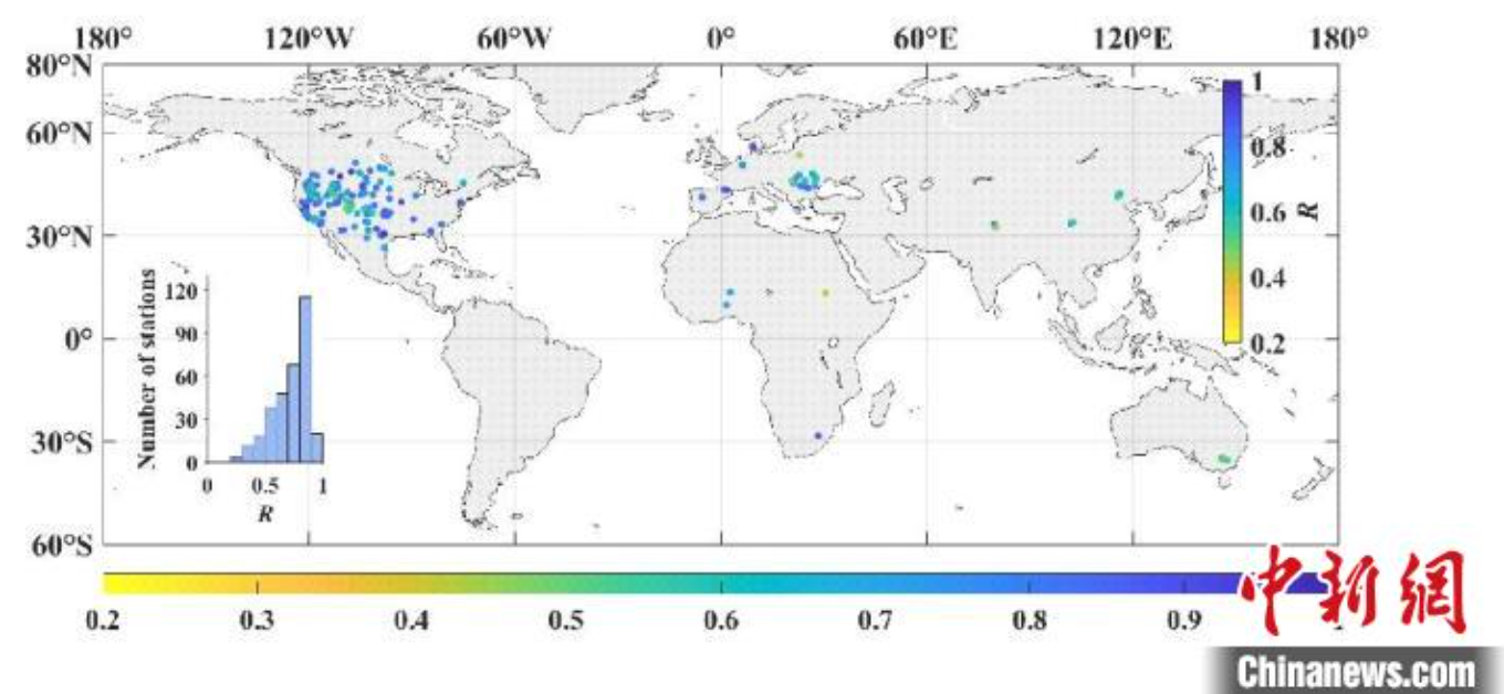 基于扩展三重匹配技术计算的全球322个土壤水分站点的空间代表性,数值(R)越大代表站点的空间代表性越好。
