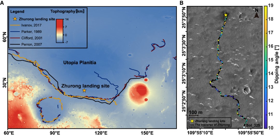 中国首辆火星车祝融号于2021年5月15日着陆于乌托邦平原南部,搭载有中国科学院空天信息创新研究院研制的火星次表层穿透雷达,用于探测地下结构和可能存在的水冰。祝融号行驶的路线位于前人提出可能存在的古海洋海岸线以北约280 千米处,海拔比该海岸线低约500米。