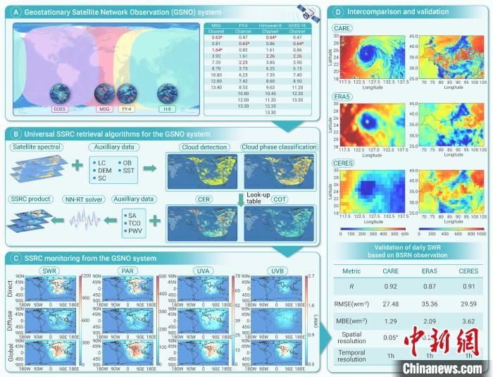 研究团队介绍,他们在2023年研发的地表太阳辐射近实时遥感监测系统基础上,此次突破多星协同过程中光谱差异和观测几何差异等带来的遥感难题,实现中国风云四号卫星、日本葵花八号卫星、欧洲第二代气象卫星和美国地球静止环境业务卫星等国际上最新一代地球静止卫星的一体化融合应用。