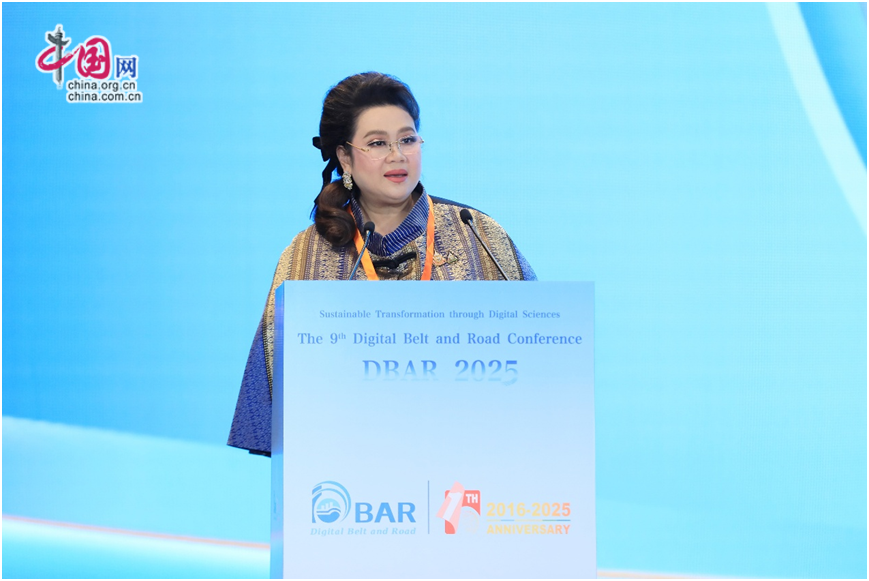 泰国高等教育与科研创新部部长素帕玛·伊萨拉帕迪(Supamas Isarabhakdi)在致辞中指出,2025年是泰中建交50周年,也是DBAR实施10周年,两项重要纪念活动的叠加充分体现了中泰合作的深化与拓展。她介绍,DBAR曼谷国际卓越中心作为数字丝路国际科学计划的首个区域研究中心,自2018年成立以来,积极推动区域与国际数字技术交流合作;面对全球挑战,应加快数字科技应用与跨学科协作服务可持续发展,期待会议推动知识共享与数字创新。