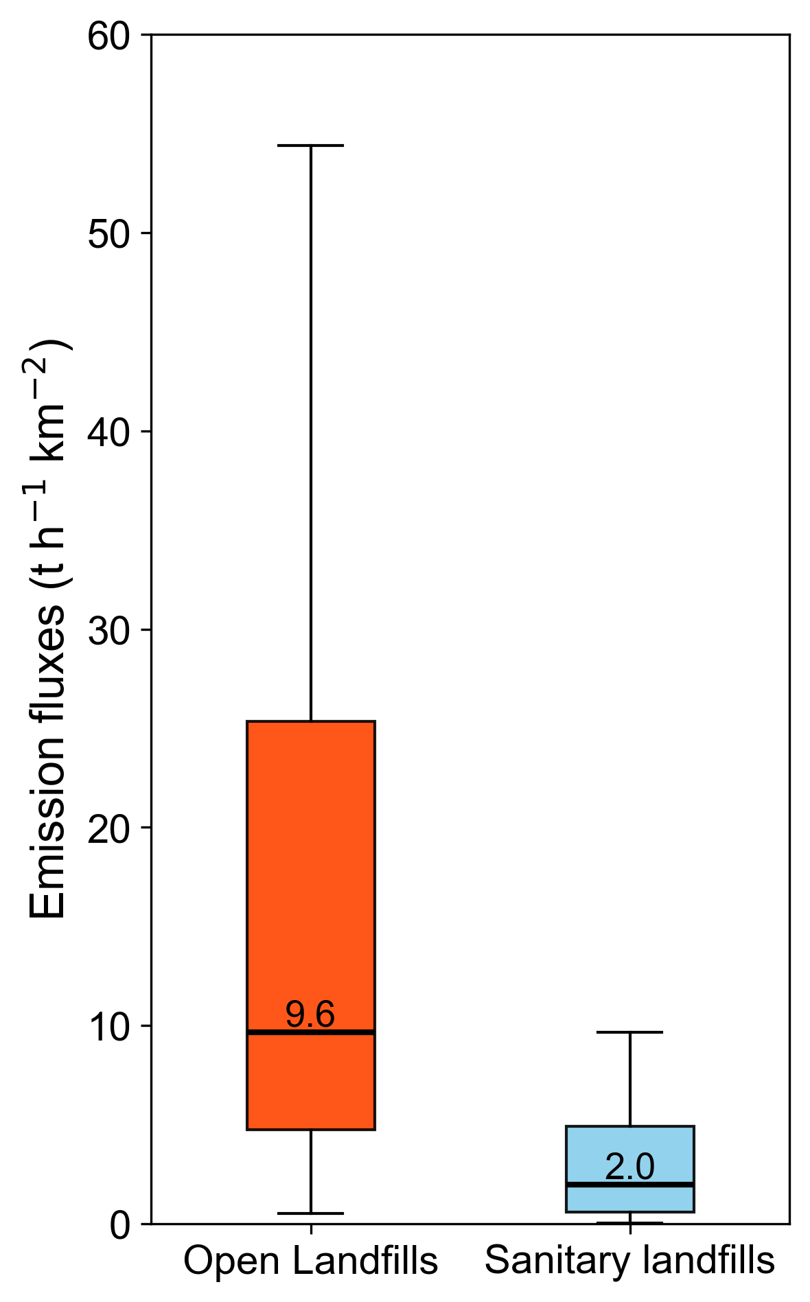 两种垃圾填埋场类型(露天垃圾场、卫生垃圾场)甲烷排放通量分布
