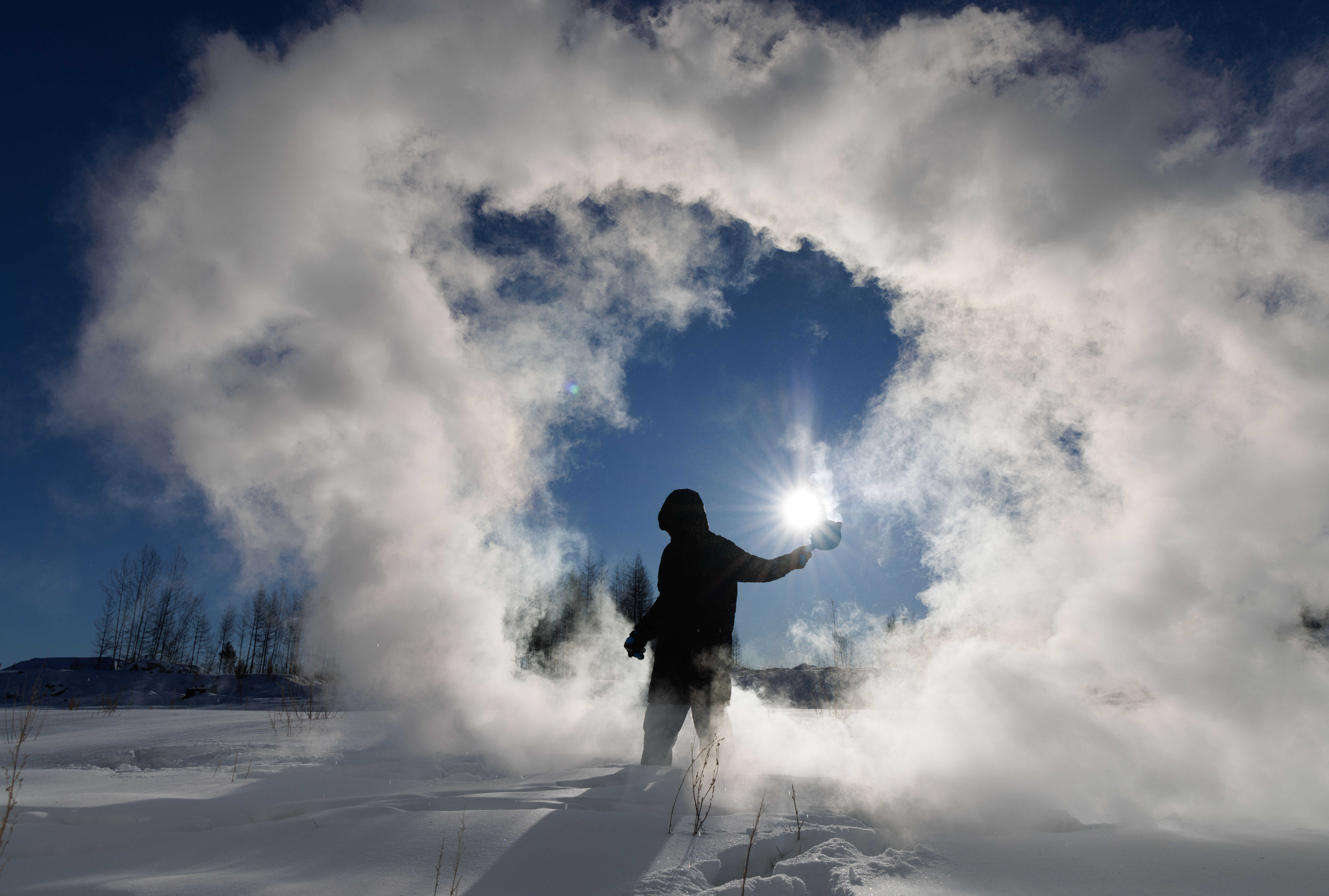 1月25日,工作之余,田冬在玩泼水成冰。
