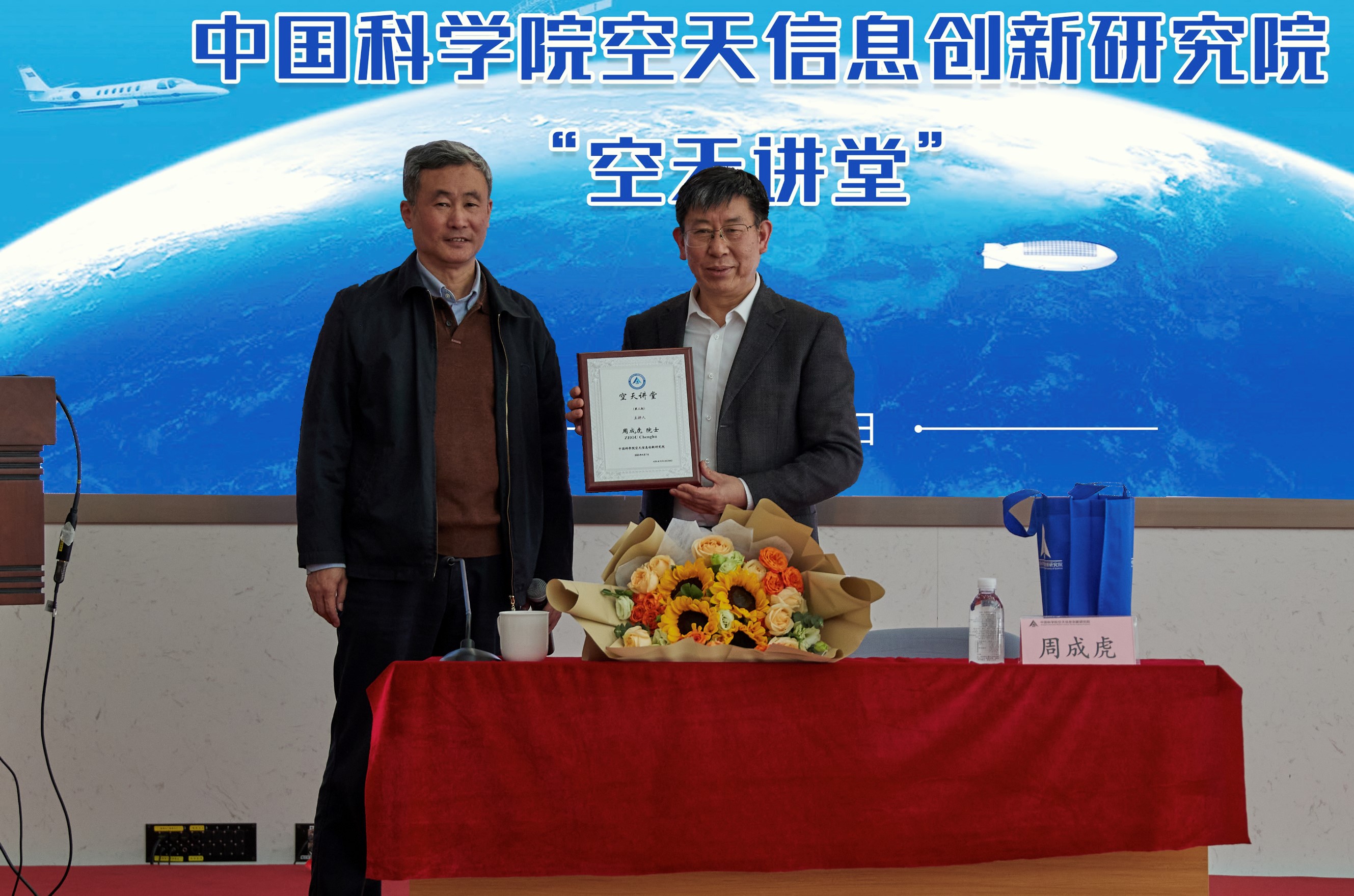 讲座结束后,蔡榕代表空天院为周成虎颁发了“空天讲堂”荣誉证书。