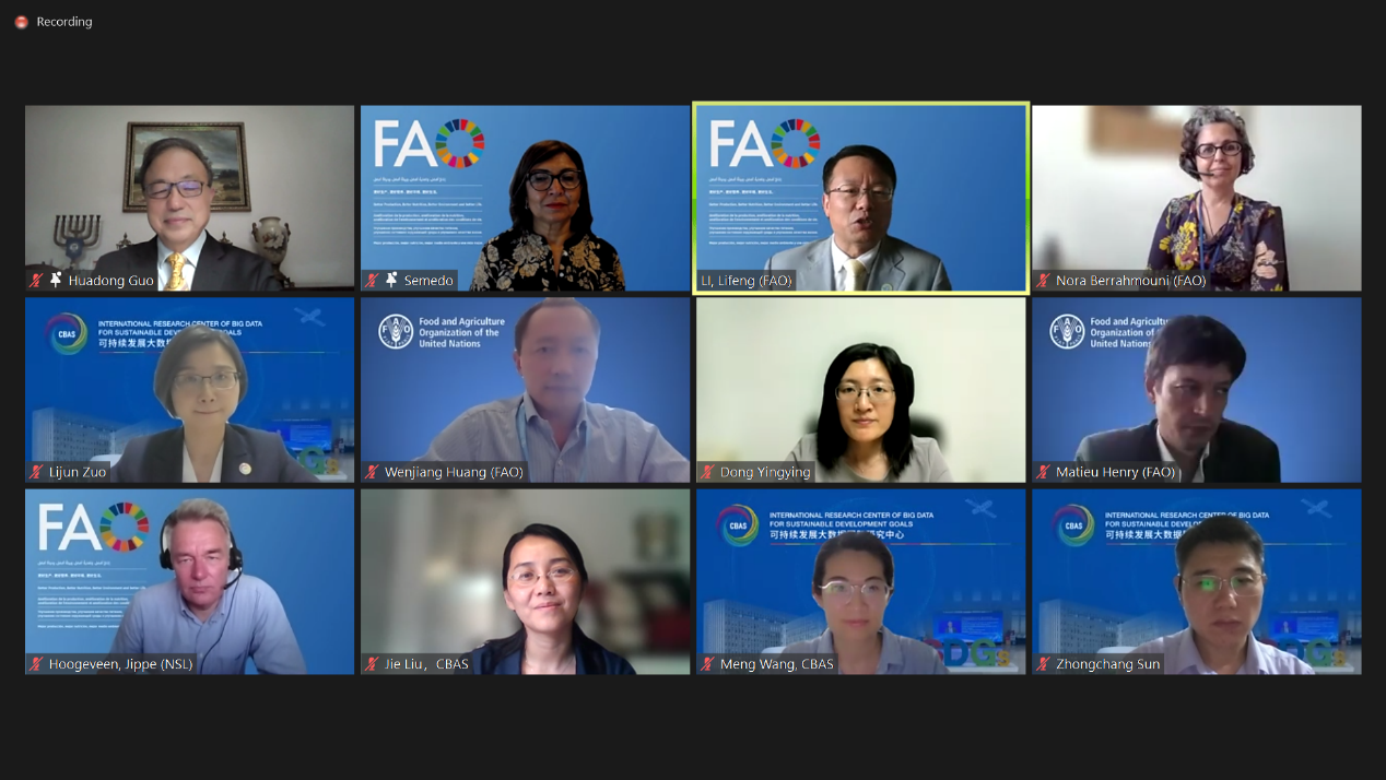 2023年6月6日,可持续发展大数据国际研究中心(SDG中心)主任郭华东与联合国粮农组织(FAO)副总干事玛丽亚·海伦娜·塞梅多(Maria Helena Semedo)在线签署谅解备忘录。该备忘录旨在巩固和发展双方运用大数据技术在农业粮食系统相关领域的合作,以促进农业自然资源管理与可持续利用,支撑全球可持续发展目标实现。2022年9月,在纽约举行的“全球发展倡议之友小组”部长级会议上,商签此项合作协议被列为落实全球发展高层对话会成果、推进全球发展倡议合作的务实举措之一。签约仪式由联合国粮农组织土地与水资源司司长李利锋主持。