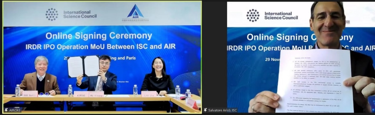 11月29日,中国科学院空天信息创新研究院(空天院)院长吴一戎与国际科学理事会首席执行官Salvatore Aric (萨尔瓦托雷 阿里科)在线签署灾害风险综合研究计划(IRDR)国际办公室二期运行合作备忘录。