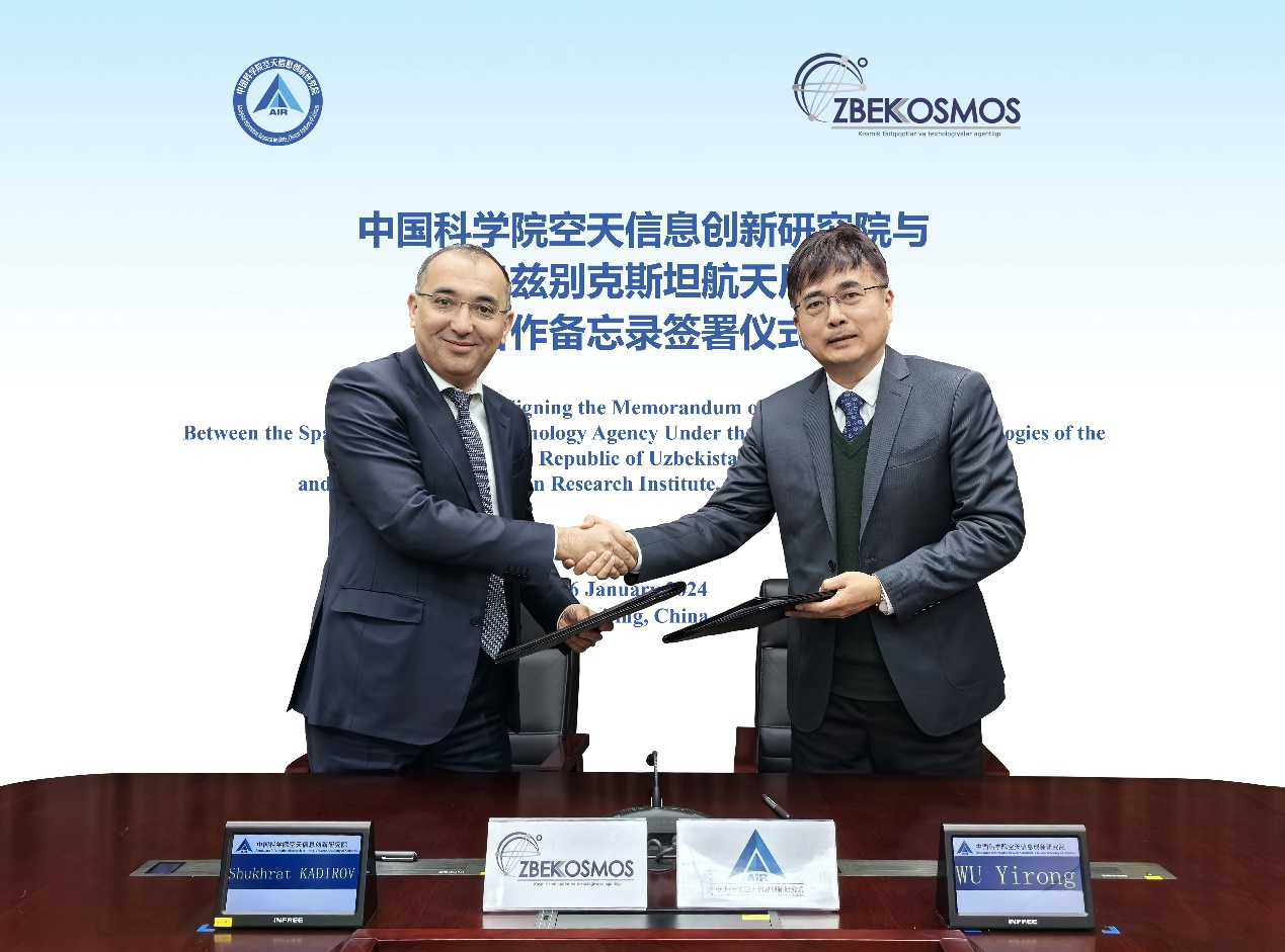1月16日,中国科学院空天信息创新研究院(空天院)和乌兹别克斯坦航天局(Uzbekspace agency)签署合作备忘录。备忘录由空天院院长吴一戎院士和乌兹别克斯坦航天局局长Shukhrat KADIROV先生签署,签约仪式由空天院遥感与数字地球重点实验室生态系统遥感研究室研究员曾源主持。