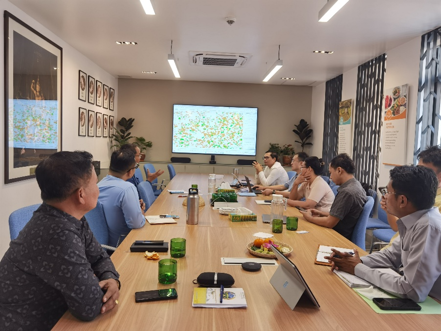 访问期间,张淼与FAO驻柬埔寨代表Rebekah Bell、柬埔寨农业部计划与统计司司长、农业信息与数据管理司司长及副司长、水稻司副司长以及自然资源管理司相关官员进行研讨。张淼详细介绍了CropWatch云平台的最新进展,包括其总体架构、系统功能升级情况、三种农情监测服务模式及在不同国家的应用实践。