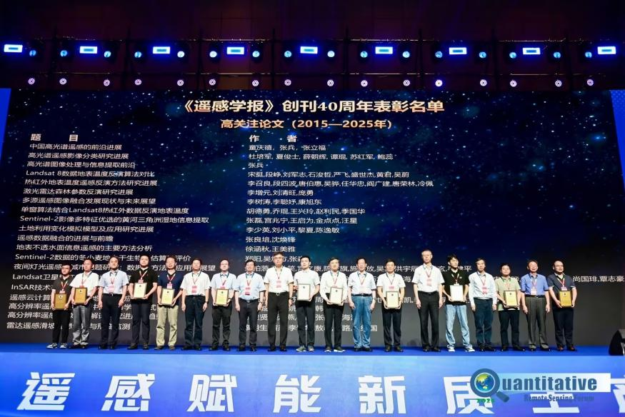 活动由《遥感学报》主编张兵主持并进行致辞。中国科学院空天信息创新研究院吴一戎院士、武汉大学龚健雅院士、长春理工大学姜会林院士、吉林大学林君院士、北京师范大学王桥院士、同济大学童小华院士、中国遥感应用协会理事长罗格,共同发布镌刻遥感科学与技术发展印记的“《遥感学报》创刊40周年纪念特刊”。随后,对2015-2025年在《遥感学报》发展过程中做出重要贡献的审稿专家和作者等进行表彰,颁发优秀审稿专家以及高关注论文证书。