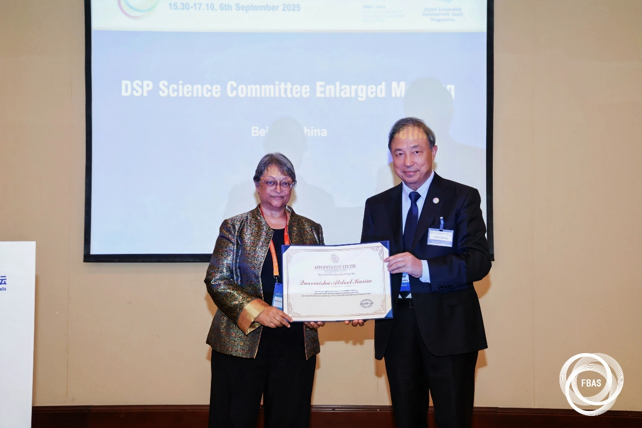 SDG中心主任郭华东院士为DSP科学委员会主席夸拉莎·阿卜杜勒·卡里姆颁发证书