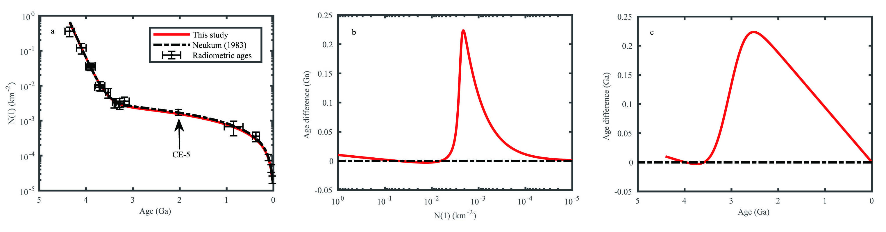 研究团队基于高分辨月球遥感影像的撞击坑统计分析结果(图1b)和撞击坑产率函数得到嫦娥五号采样点地质单元的撞击坑归一化频率(即N(1)值),与嫦娥五号样品的年龄构成建立月球年代函数模型一组新的控制数据,通过非线性最小二乘拟合算法,对Neukum (1983)年代函数进行更新,建立了新的月球年代函数模型: