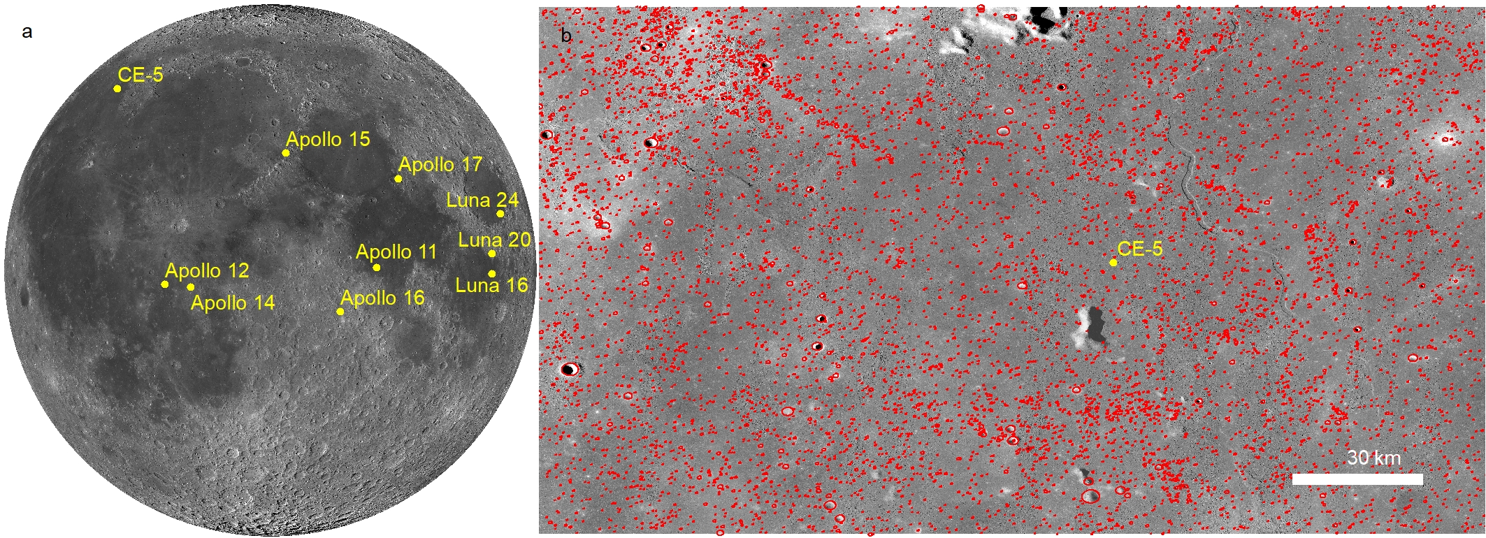 图1. 月球着陆采样区域(a)和嫦娥五号着陆区撞击坑统计(b)