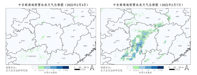 2022年春节期间,我国南方部分地区出现低温雨雪天气,给当地交通出行、电力保障、农业生产造成不利影响。科研人员针对全国积雪覆盖及局部地区雨雪冰冻发展态势开展了积雪分布及雨雪过程特征监测分析(图3),完成华北和华南地区持续动态监测和雨雪冰冻强度研判,并向广西科技厅自治区应急管理厅发送桂北高山区雨雪冰冻分布信息,为全国及地方灾害、消防应急等提供保障服务支持。