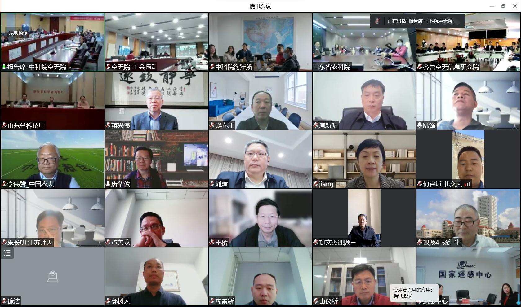 科技部地球观测与导航重点专项管理办公室处长赵鲜东、副处长徐泓,山东省科技厅二级巡视员许勃、处长韩绍华,中科院重任局光电空间处副处长杜晓明,以及项目责任专家和咨询专家受邀到会指导。中科院空天信息创新研究院(以下简称“空天院”)院长吴一戎、党委副书记吴海涛,科技处以及项目团队代表共200余人通过线上线下相结合方式参加会议。