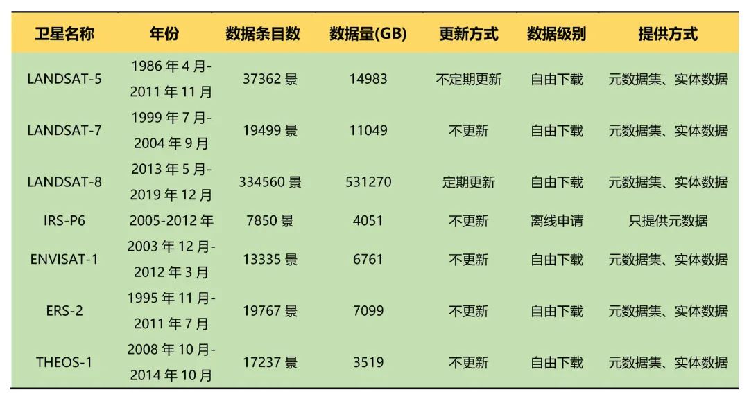 为进一步扩大“对地观测数据共享计划”的社会影响,自2022年开始,中国遥感卫星地面站委托国家对地观测科学数据中心发布中国遥感卫星地面站共享数据专用门户,在国家综合地球观测数据共享平台继续推进“对地观测数据共享计划”,保持共享数据资源的持续更新。中国遥感卫星地面站共享数据专用门户的网址为https://www.chinageoss.cn/rsgs/。网站目前已提供了Landsat 5/7/8、IRS-P6、Envisat-1、ERS-2、THEOS-1等7颗卫星的中国区域历史存档数据的共享下载(详细信息见下表),未来还将有更多卫星数据会陆续发布和更新。