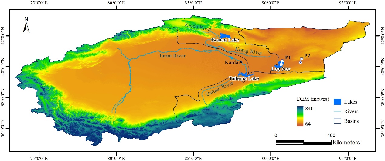 保护和恢复处于退化状态的干旱区湖泊生态环境是备受全球关注且紧迫的问题。有“死亡之海”之称的新疆罗布泊位于中国最大内陆盆地塔里木河流域,是中国四大无人区之一(图1)。在过去1800多年间,受气候变化和人类活动双重影响,罗布泊的生态环境经历了沧海桑田到大漠戈壁的巨变。曾经这里土肥水美,林草鸟兽虫鱼等生物资源丰富,作为丝绸之路上的重要节点,承载见证过区域内人类文明(如楼兰古国)的兴衰起落。然而,6500万年以来青藏高原的整体抬升,阻隔了翻越高原并深入西北地区的水汽通道,区域内气候逐渐干旱,改变并重新塑造了区域生态系统格局。上个世纪初,随着区域内生产生活的发展,用水量急剧增加,加剧了区域生态环境的干旱化,使得罗布泊成为了“死亡之海”。