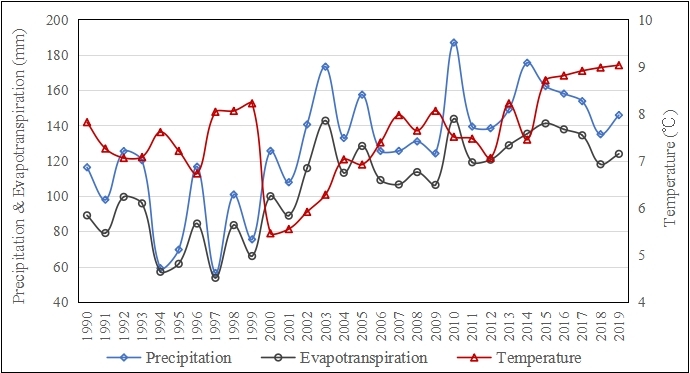 图2 塔里木盆地1989年至2019年年降水量、蒸散量和平均温度的变化趋势