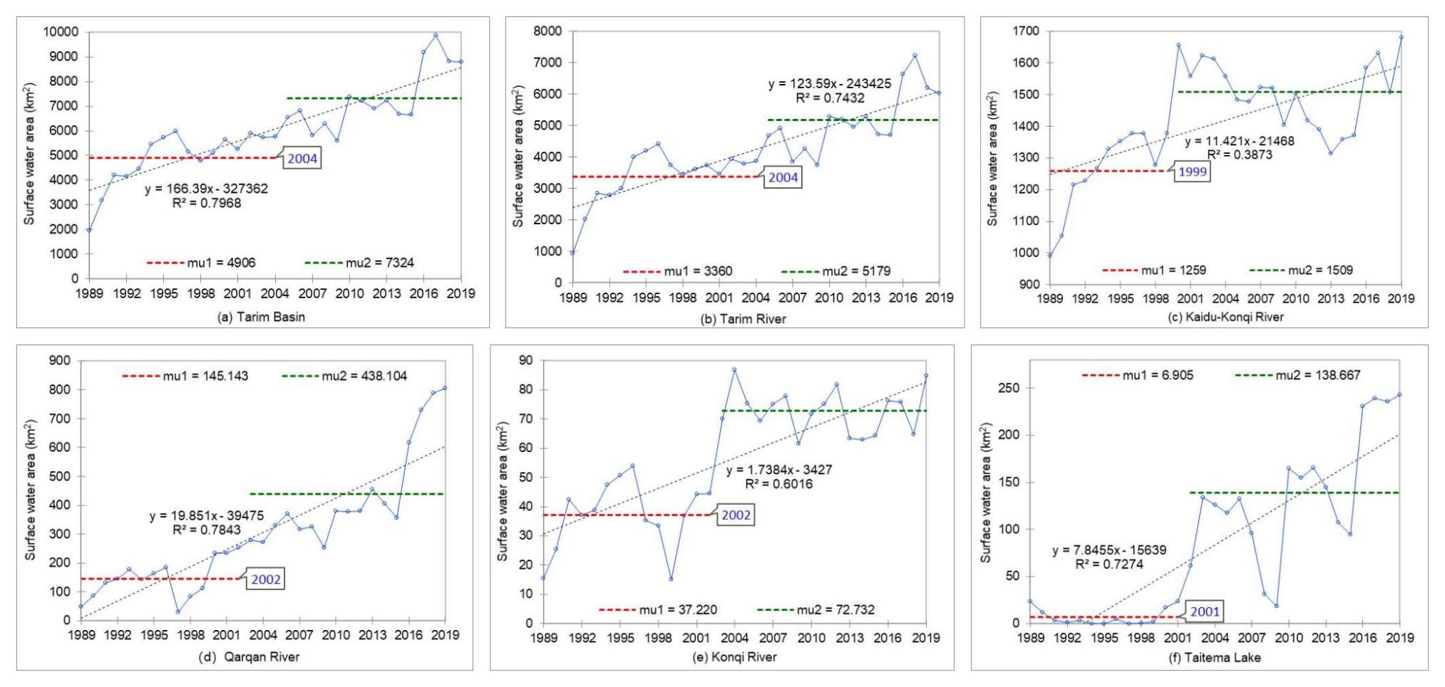 图3 1989年至2019年塔里木河流域及其支流地表水面积变化趋势和拐点变化时间