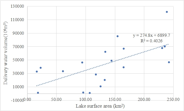 图4 塔里木河下游尾闾湖台特马湖地表水面积与塔里木河生态输水总量之间的关系
