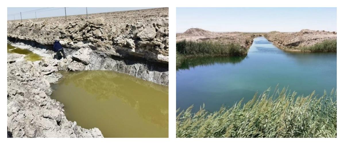 图6 2021年7月在罗布泊核心区(左)和山前边缘地带(右)观察到的地下水出露深度
