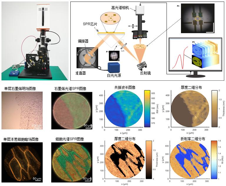 为了解决这些难题,研究人员提出了一种高光谱SPR显微成像传感方法,构建了基于棱镜耦合的高光谱SPR显微镜系统,简称为HSPRM。研究人员首先将高光谱成像仪与单筒显微镜组装成为高光谱显微镜,然后用它对棱镜耦合型SPR成像传感器输出的大视场光谱图像进行选区分析,获得关于待测样品微观区域的SPR高光谱图像。组成该图像的原始数据是一个x-y平面代表空间信息、z轴代表光谱信息的数据立方体。研究人员开发了针对该数据立方体的处理方法和软件,从处理后的数据立方体中可提取出在可见-近红外光谱区间任一波长的高分辨灰度图像和任一像素的高分辨共振光谱,进而利用各个像素对应的共振波长建立样品被观测区域的共振波长图像。为了实现量化分析,研究人员还提出了基于菲涅耳公式和布拉格曼等效介质近似方程相结合的实验数据拟合算法,通过对测得的共振波长进行仿真拟合,就可得到样品被观测区域的厚度、折射率、孔隙率等参数的二维分布。研究人员对HSPRM的入射角进行了逐像素校准,消除了SPR灵敏度的像素间差异性,在此基础上使用HSPRM分析了附着于SPR芯片表面的单层石墨烯厚度分布、蛋白质的不均匀吸附以及粘附单细胞的折射率分布及细胞壁厚度分布。