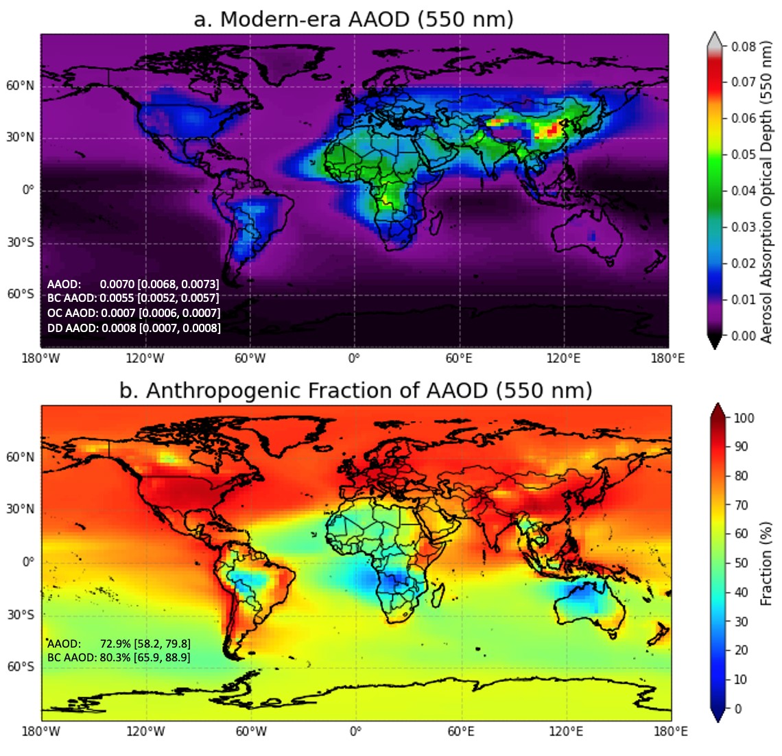 研究表明,当前全球的气溶胶吸收光学厚度(mid-visible)估计在0.0070, 95%置信区间[0.0068,0.0073],三种主要的吸收性气溶胶成分贡献分别为:黑碳(0.0055)、有机气溶胶(0.0007)以及沙尘(0.0008)。研究估计出人为排放对气溶胶吸收的贡献为72.9%[58.2%,79.8%], 而黑碳气溶胶人为排放的贡献高达80.3%[65.9%,88.9%]。这些结论普遍高于第五次与第六次IPCC 评估结果1.3到1.8倍,表明由人类活动引起的气溶胶吸收及其对环境健康和气候的效应需要得到更多的关注和精准的评估。研究进一步评估了气溶胶瞬时直接辐射强迫为-0.14 W/m2 [-0.25,+0.01],其中黑碳直接辐射强迫估计在+0.33 W/m2 [+0.17,+0.54]。总体而言,此项研究证明通过更加先进的遥感观测手段,如多角度偏振遥感,可以得到更准确的气溶胶细节特性的大尺度空间分布,并进一步约束气溶胶气候效应研究。