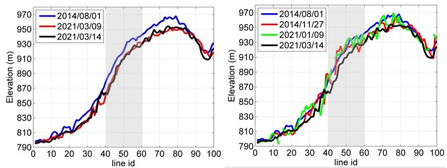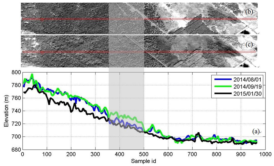 前期研究表明,利用有叶季与无叶季协同,可望实现落叶林区的三维结构测量,但新的研究发现,地形和森林密度的变化使得该推论并不总是有效。于是进一步研究了从8月份有叶季到3月份无叶季8个时相的数据,伴随着太阳高度角从55.62°到15.66°的变化,在不同地形和森林密度条件下,林区光学多角度立体观测点云的垂直分布规律。结果发现,在非密闭森林中,9月初的点云更接近冠顶,而8月的点云更接近地面,如图1灰色区域所示;北向坡面在无叶季且有光照的情况下,点云接近地面,而在11月或1月份太阳高度角较低,没有光照的情况下,即便是无叶季,点云也主要分布在冠顶,如图2灰色区域所示,遥感影像上可见光照背景的比例是控制着对林下地形的探测能力,这可以解释多时相点云高程差值的变化规律如图3所示。