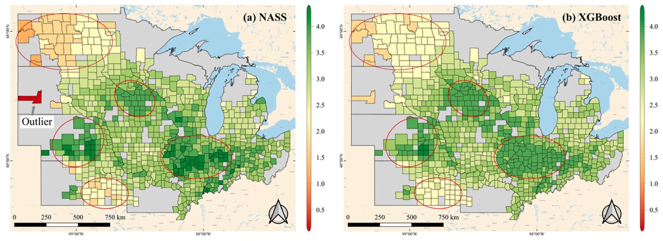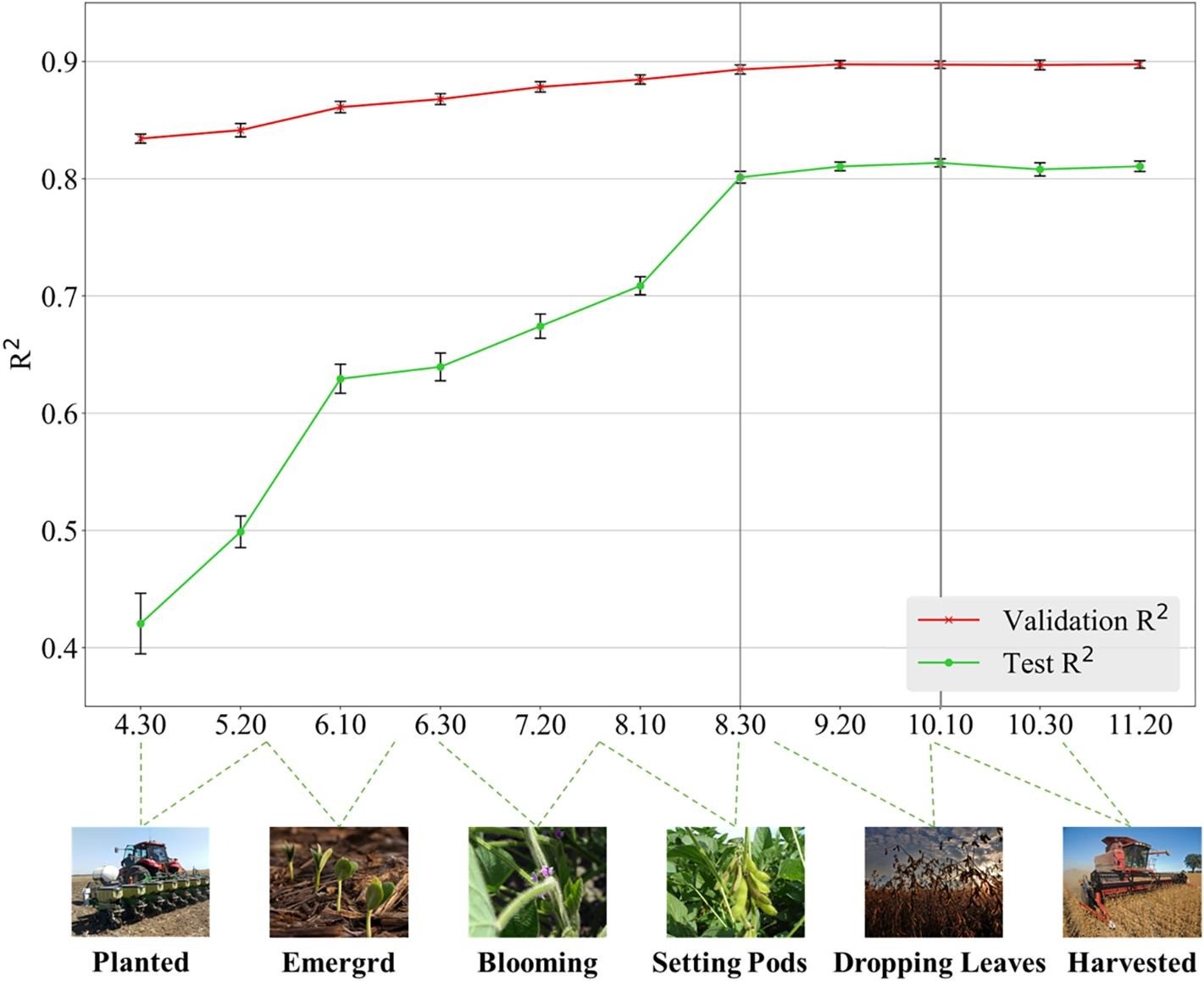 近日,中国科学院空天信息创新研究院遥感科学国家重点实验室全球农情遥感速报系统(CropWatch)的吴炳方研究员与曾红伟副研究员团队,联合澳大利亚昆士兰和南京农业大学等团队,提出了多维度特征工程和极端梯度提升树(XGBoost)耦合的美国县级尺度大豆单产的预测框架,实现大豆单产的近实时动态更新预测,量化了大豆单产预测的最关键物候期与主导关键因子,取得较好预测效果。
