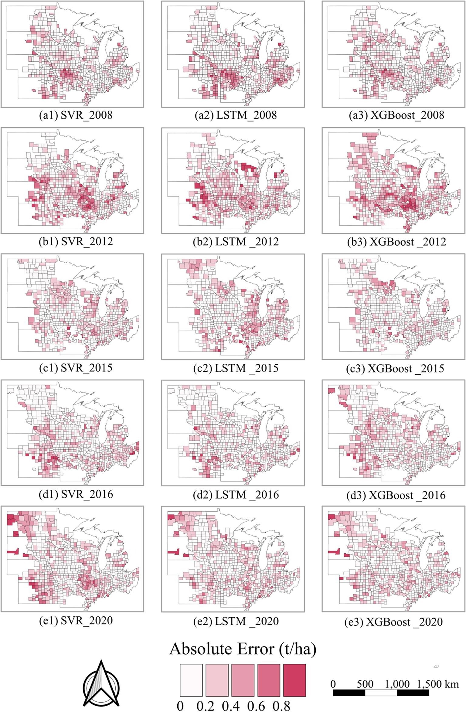 XGBoost与SVR和LSTM在典型年份的大豆单产预测空间误差分布