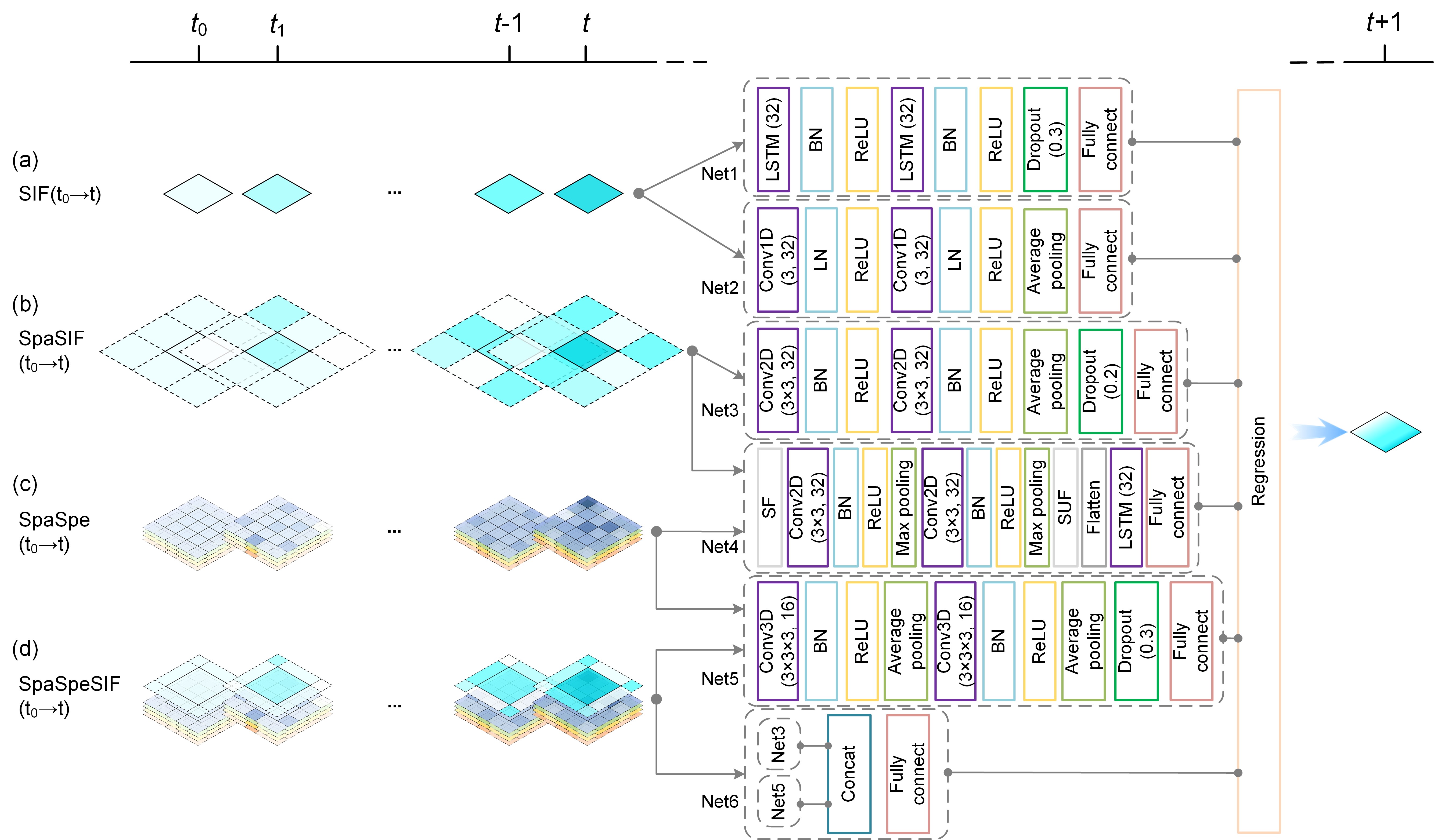 为此,研究团队在“棉花一张图”工作的基础上,利用Sentinel-2光学遥感影像、多尺度卫星日光诱导叶绿素荧光(SIF)产品等多源遥感数据,探究了SIF的时空预测(STP)产品在棉花产量预测方面的可行性。研究团队首先提出STP-SIF问题(图1),分析其潜在的驱动机制,并设计时序数据驱动的深度学习方法(图2);其次,生产STP-SIF产品,并探讨产品在棉花生长季中期产量预测上的准确性。