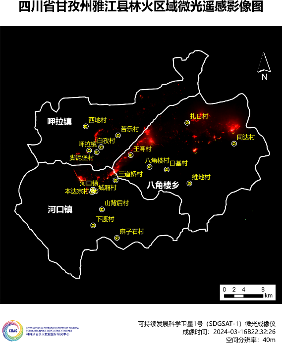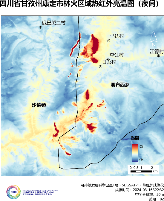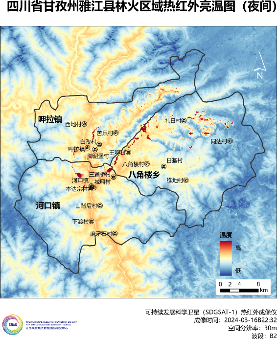 为助力甘孜州受灾区域的救灾工作,SDG中心卫星应急团队连夜紧急处理和分析影像。SDGSAT-1卫星分别于3月16日晚和19日中午过境灾区,拍摄到16日雅江和康定两地的夜间热红外和微光影像,以及19日雅江的日间热红外和多谱段影像。